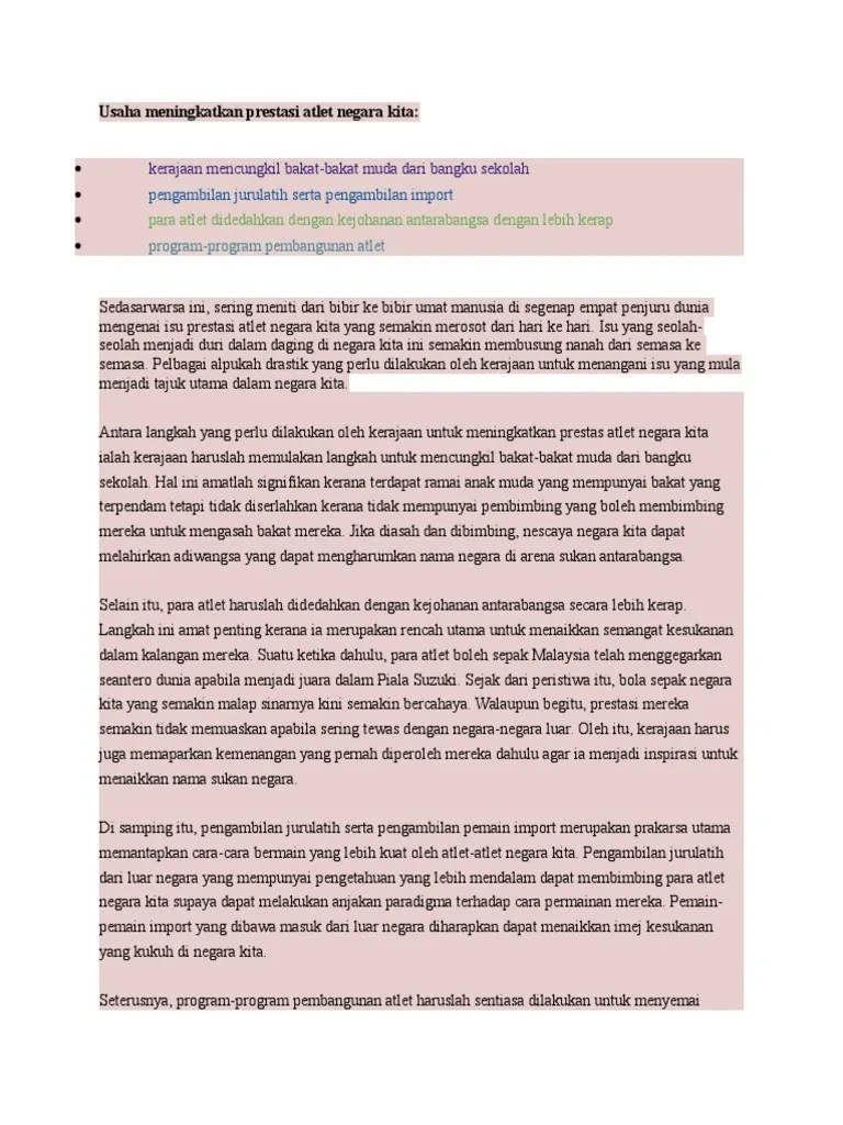 Sukan merupakan salah satu aktiviti yang menjadi tumpuan utama masyarakat, khususnya . Sebagai wartawan sebuah majalah sukan, anda ditugaskan untuk menulis rencana yang . Kekalahan skuad bola sepak kebangsaan dalam pertandingan kelayakan piala dunia kepada pasukan . Langkah meningkatkan mutu sukan negara. Usaha bagi meningkatkan mutu sukan negara.